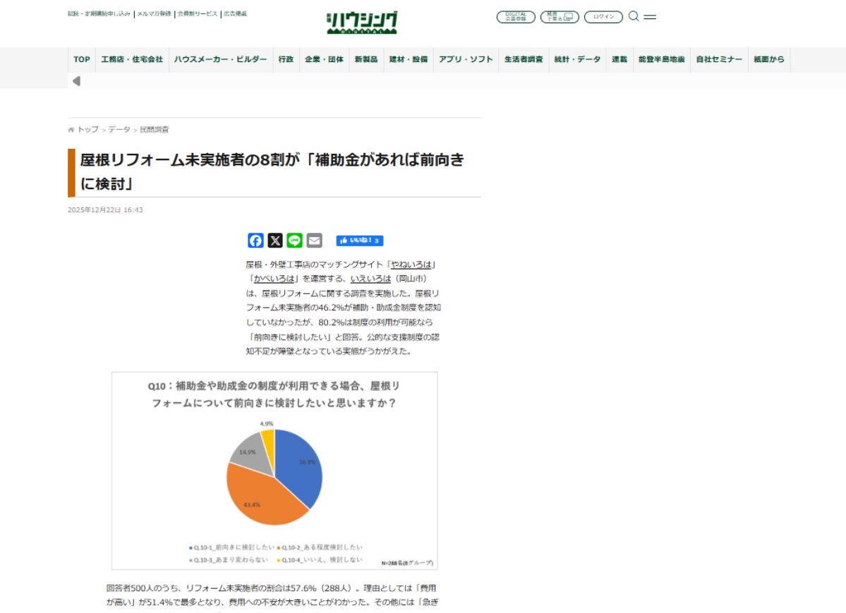 いえいろは株式会社が実施したアンケート調査「屋根リフォームに関する実態調査:実施の決め手は『老朽化』と『信頼できる情報源』、補助金制度の利用も突破口に。」が、 新建ハウジング(株式会社新建新聞社)にて「屋根リフォーム未実施者の8割が「補助金があれば前向きに検討」というタイトルで紹介されました。